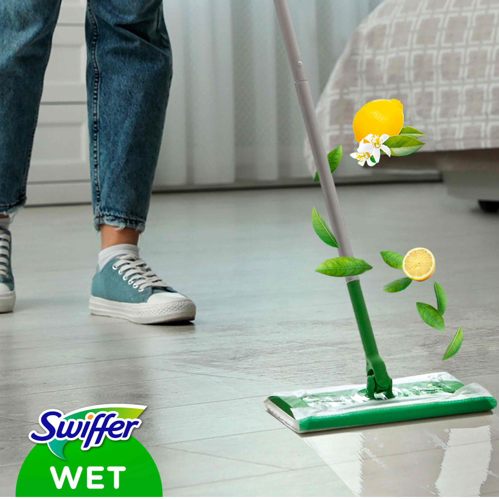 Kdo říkal, že Swiffer je jen na suchý úklid? Swiffer nabízí také čisticí ubrousky na vytírání podlah napuštěné účinnými čisticími prostředky, které rozpouští nečistoty, absorbují je a odstraňují z povrchu. Jedinečným řešením, díky kterému budou Vaše podlahy čisté a voňavé, jsou: čisticí prostředek, který rozpouští nečistoty, a ubrousek, který je absorbuje a odstraňuje z podlahy. Díky tomu bude úklid Vašich podlah z dlaždic nebo linolea snadný. Pro odstranění odolných skvrn jednoduše otočte hlavici Swifferu a vydrhněte skvrny pomocí drsnějšího zeleného proužku. Díky ploché hlavici Swifferu dosáhnete na místa, na která byste se jinak nedostali (pod gaučem, postelí, lednicí, myčkou atd.) Ano, ze Swifferu Sweeper se právě stal univerzální nástroj: pro utírání prachu používejte suché čisticí ubrousky a pro mytí podlah ubrousky napuštěné čisticím prostředkem. Jsou vhodné pro použití také na dřevěné podlahy. Ubrousky Swiffer Sweeper napuštěné čisticím prostředkem NEPOUŽÍVEJTE na neupravené, olejované nebo voskované dřevěné povrchy, ani na nelepenou dlažbu nebo koberce.