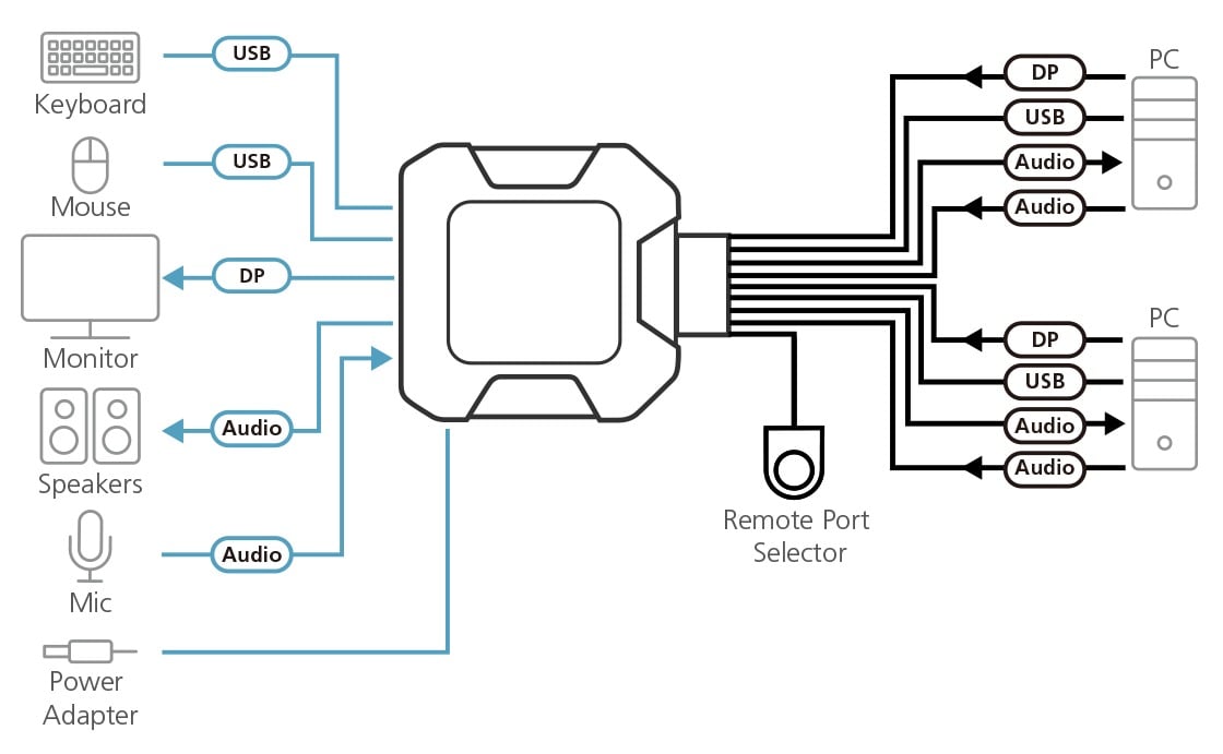 S CS-22DP můžete rychle a bez námahy přepínat mezi dvěmi počítači s obrazem DisplayPort pomocí tlačítka pro volbu vzdáleného portu na externím selektoru.