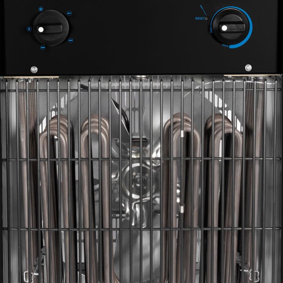 Max. topný výkon: 15 kW (12.900 kcal/hod., 3 topné stupně: 5 kW/10 kW/15 kW), prostorový termostat (automatické zapínání/vypínání topné spirály po dosažení nastavené teploty), ventilátor.