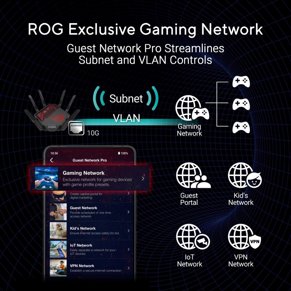 dvoupásmový WiFi 7 (801.11be) AiMesh rozšiřitelný router, 7,2 Gb/s, 34G kabelová kapacita, dva 10G porty, SFP+ port, čtyři 2,5G porty, zabezpečení na komerční úrovni, Guest Network Pro, VPN
